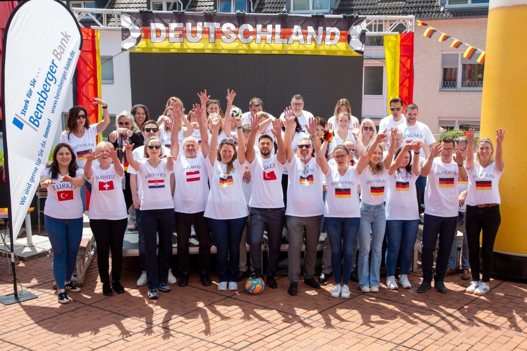 Bensberger Bank – Team jubelt zur EM 2024 – T-Shirts zeigen die Nationalitäten